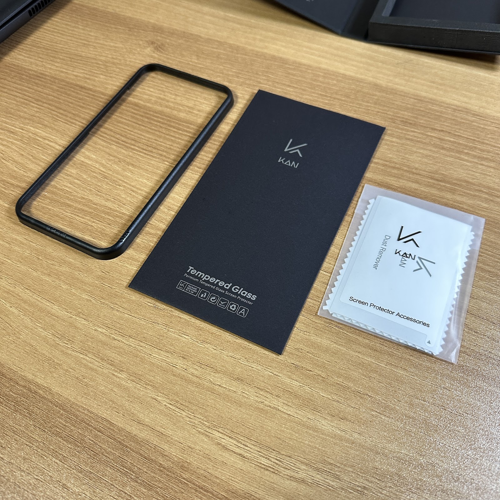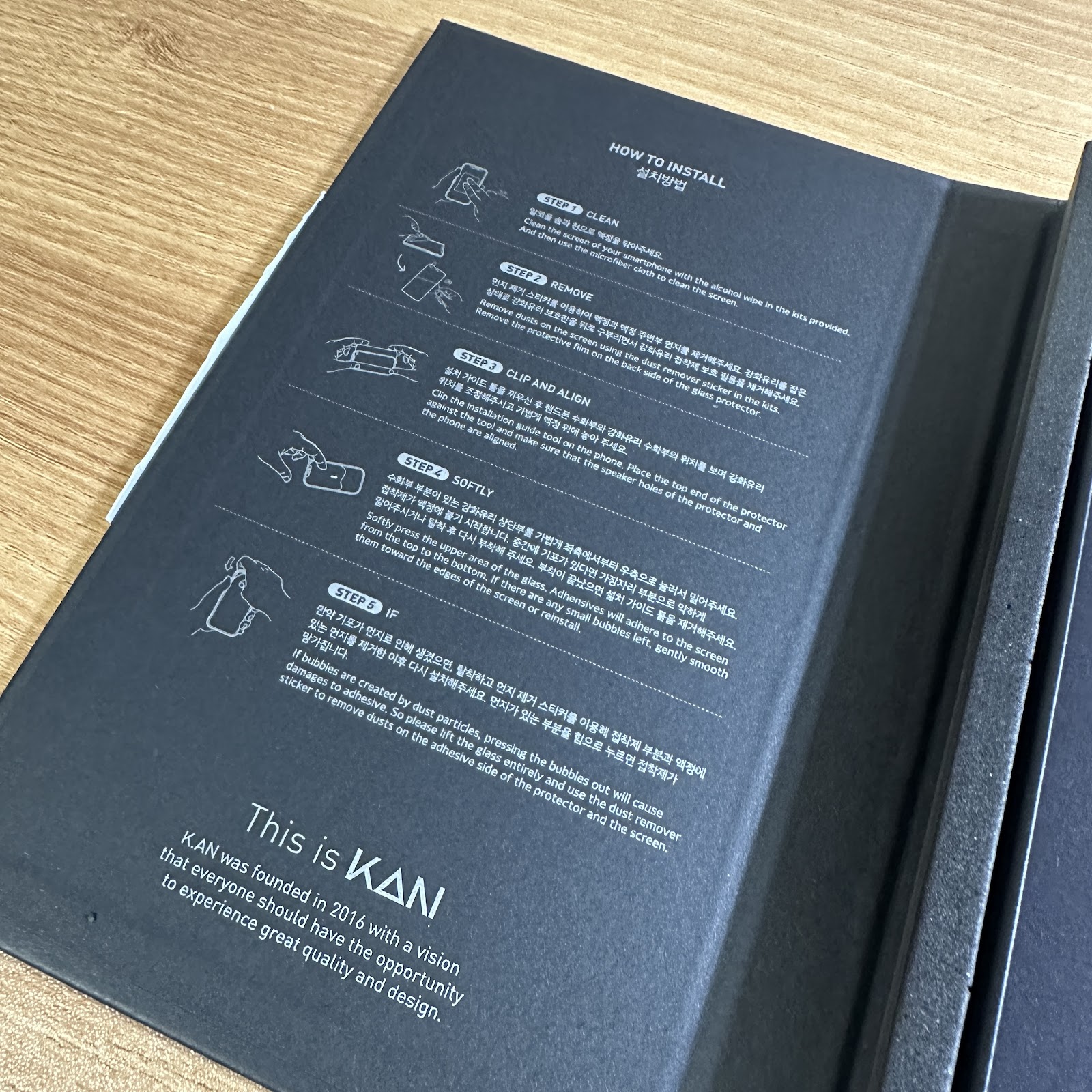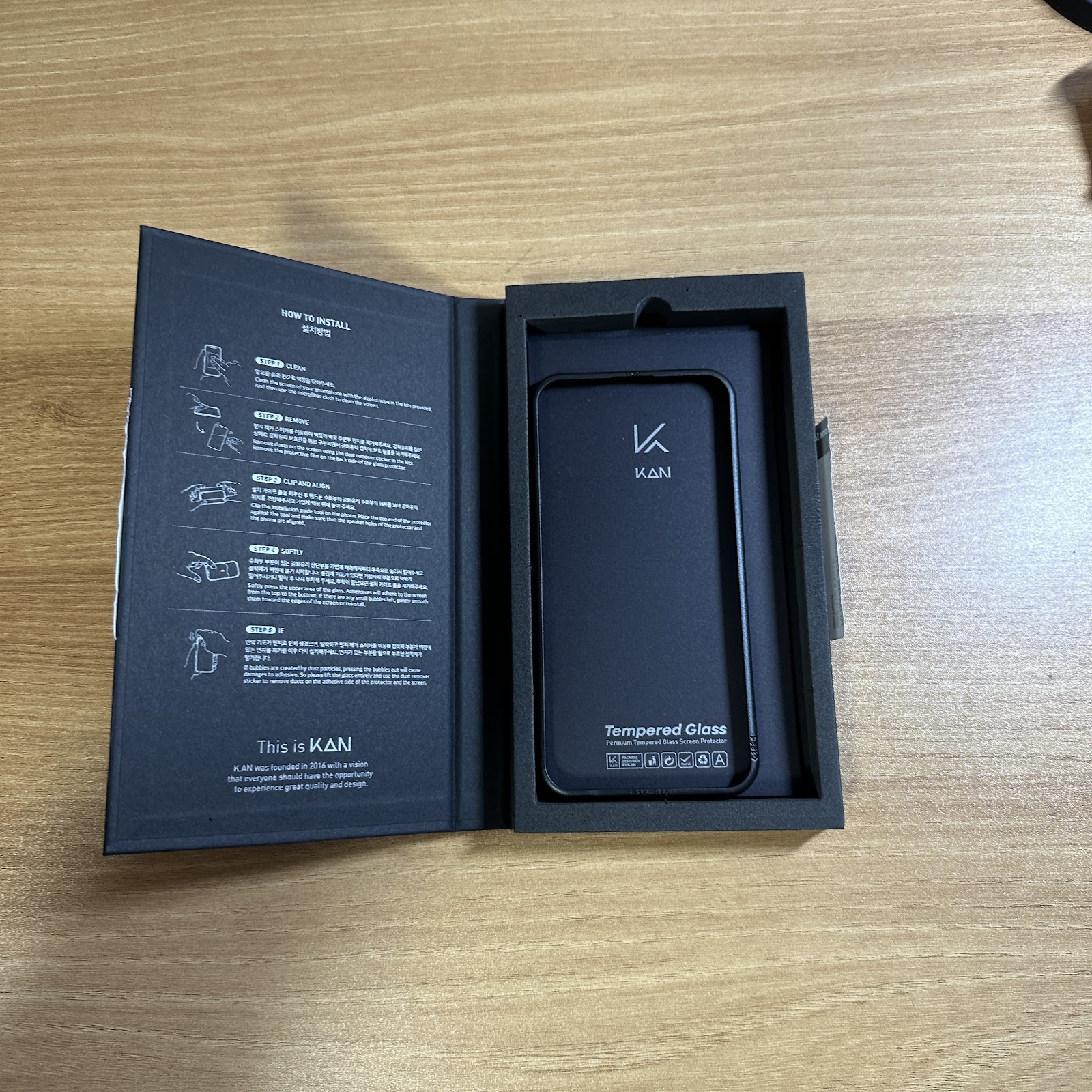 우선 제품을 받으면 가장 먼저 보고 첫인상을 결정해주는 것이 있습니다. 바로 제품 포장입니다. 사실 강화유리의 경우 제품 포장에 신경을 잘 안쓰는 곳들이 많아 큰 기대를 안했으나 기대 이상이었습니다. 검은색의 고급스러운 포장을 가지고 있고, 간단한 제품 설명이 적혀있습니다.